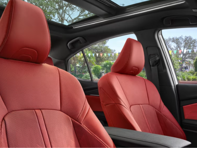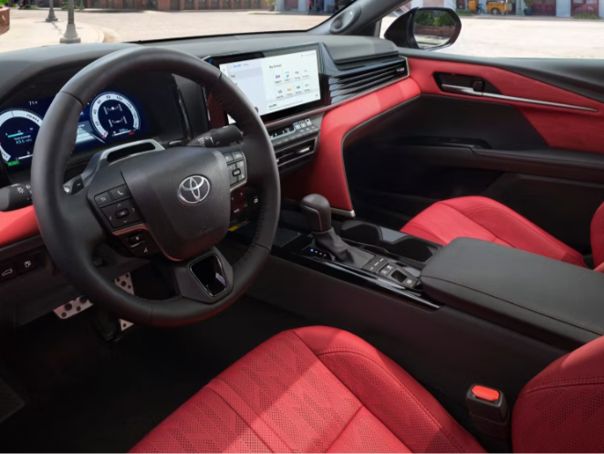 Offering a bold look inside and out, the 2025 Toyota Camry Hybrid cuts a striking pose with its chiseled lines, low and wide stance, and sleek aerodynamic roofline. Eye-catching exterior colors like Supersonic Red and heavy metal Gray are available, along with two-tone options like Ocean Gem with midnight Black metallic. LED headlights and taillights provide both style and exceptional visibility. Step inside the 2025 Toyota Camry Hybrid’s spacious and modern cabin, designed with clean lines and sophisticated touches to bring your interior experience to the next level. A prominent trim element elegantly stretches across the dashboard, drawing the eye along easily, while ambient lighting soothes and relaxes. Acoustic-laminated glass offers a quieter ride, while adjustable rear headrests and a heated steering wheel all contribute to a feeling of opulence.